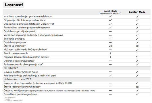 - Comfort Mode (uporaba prek interneta): prednosti so daljinsko odpiranje, potisna sporočila, povezava s sistemi pametnega doma (kot je Alexa), dostopi do doma so beleženi, podpora je oddaljena, možnost pa je tudi razširitev do 100 uporabnikov.