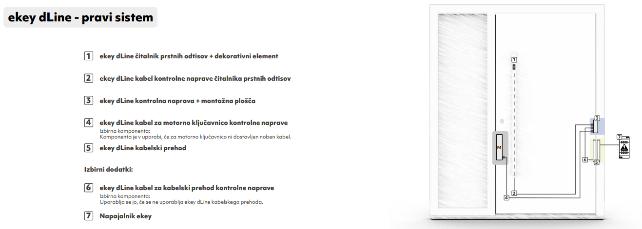 - V setu poleg ročaja pridejo čitalnik, dekorativni element, krmilna enota, čelnica za pritrditev krmilnika in kabelskega prehoda, snemljiv kabelski prehod ter napajalnik. Kabel za ključavnico ni del seta. V primeru, da kabel ni priložen motorni ključavnici, se ga lahko naroči posebej.